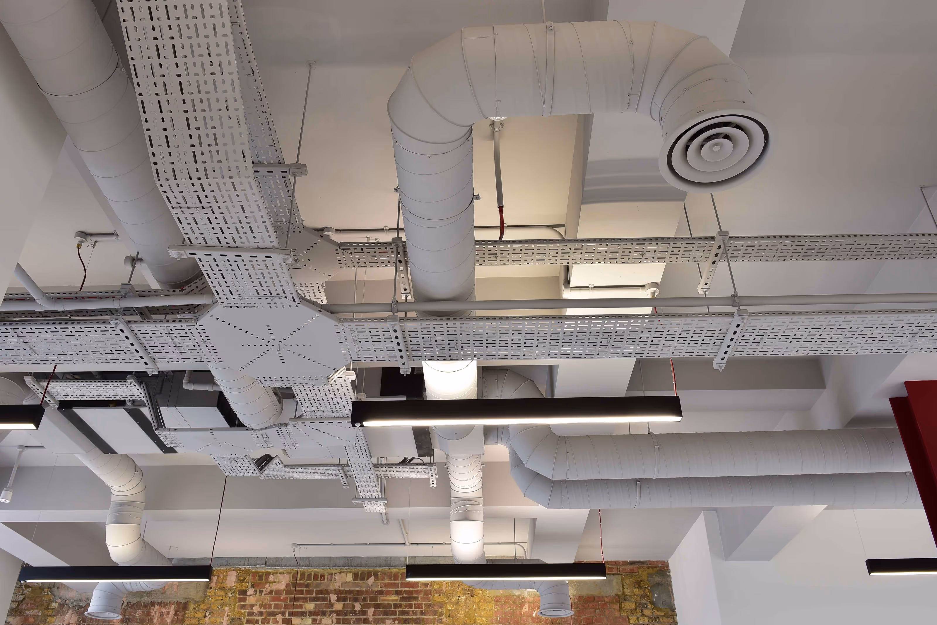 With the stress being on the exposed ‘industrial’ look, we installed galvanised containment systems to complement the visual quality. Galvanised twin wall ductwork was installed to provide insulation and acoustic properties without detracting from the industrial aesthetics.
