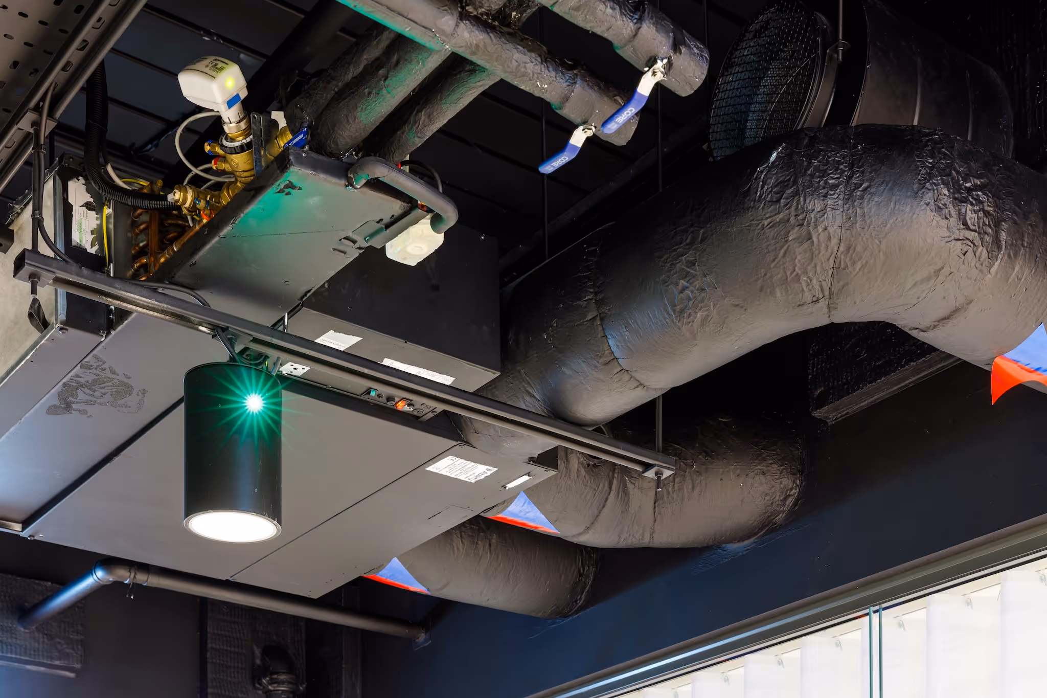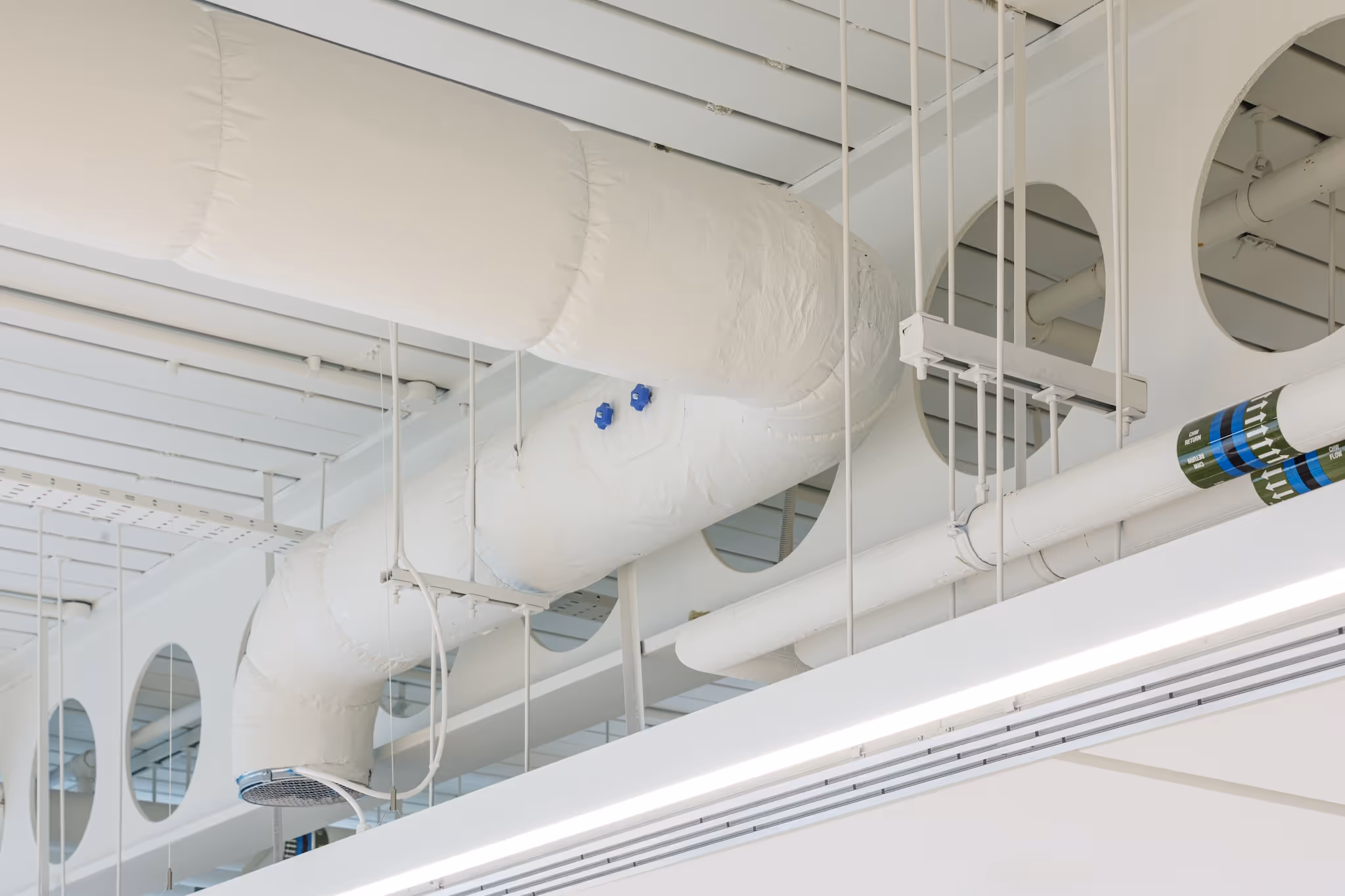 The building was lab-enabled with an AHU on the floor to provide the additional air volume required. An additional challenge presented by this project was the requirement to install ductwork through castellated beams in the ceiling void.